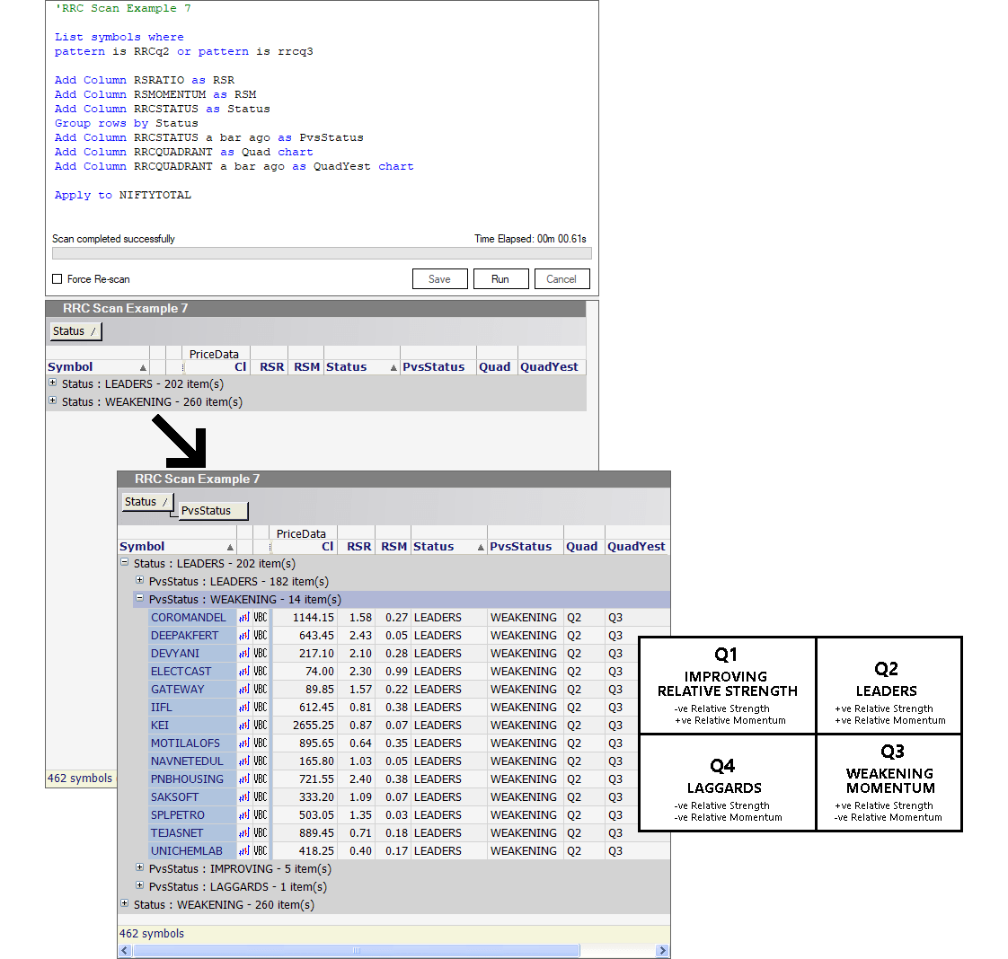The “RRCSTATUS” function helps us figure out which quadrants a symbol falls into on the chart, and it gives us one of these labels like “LEADERS” or “LAGGARDS” to describe its position.